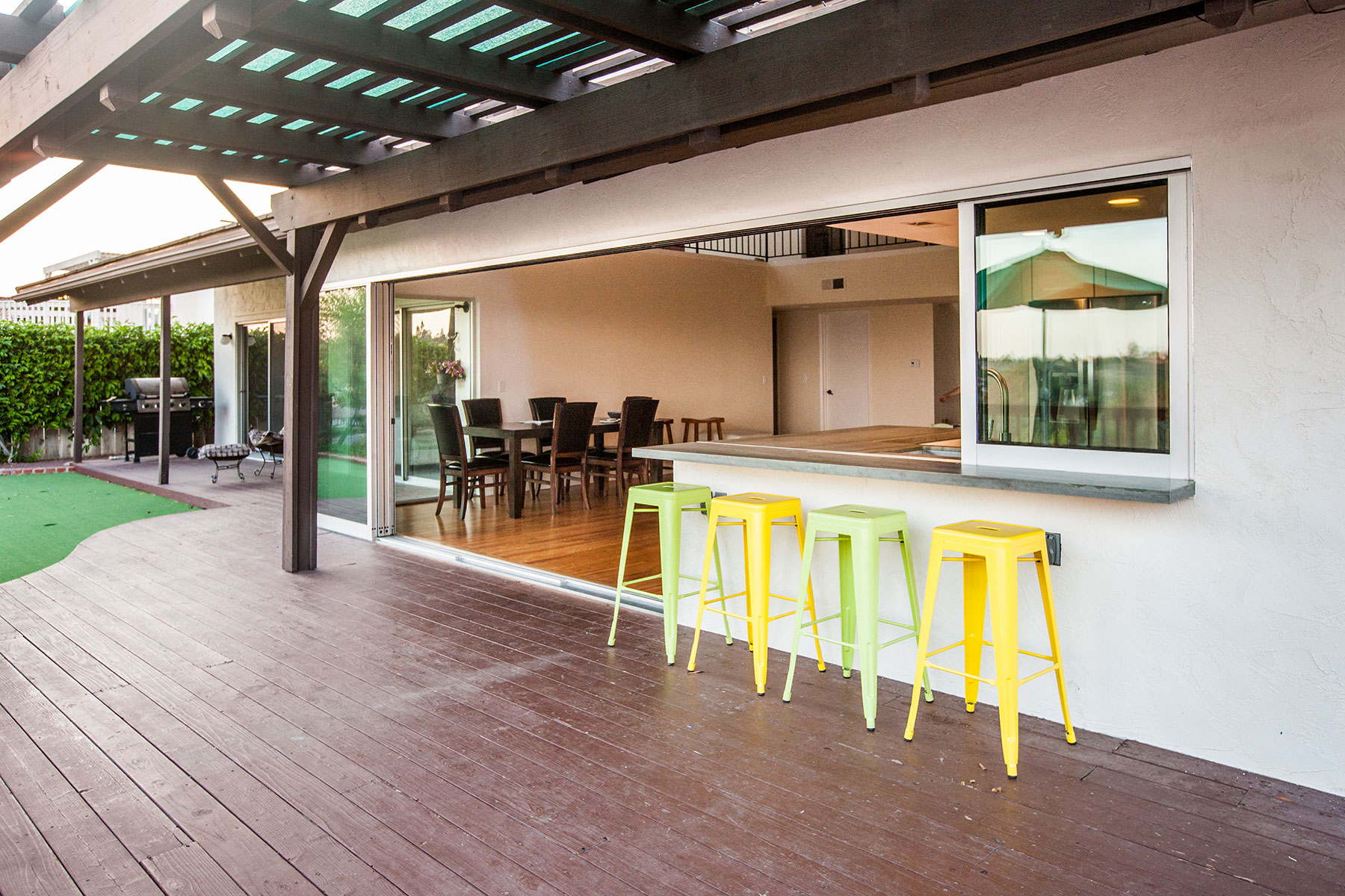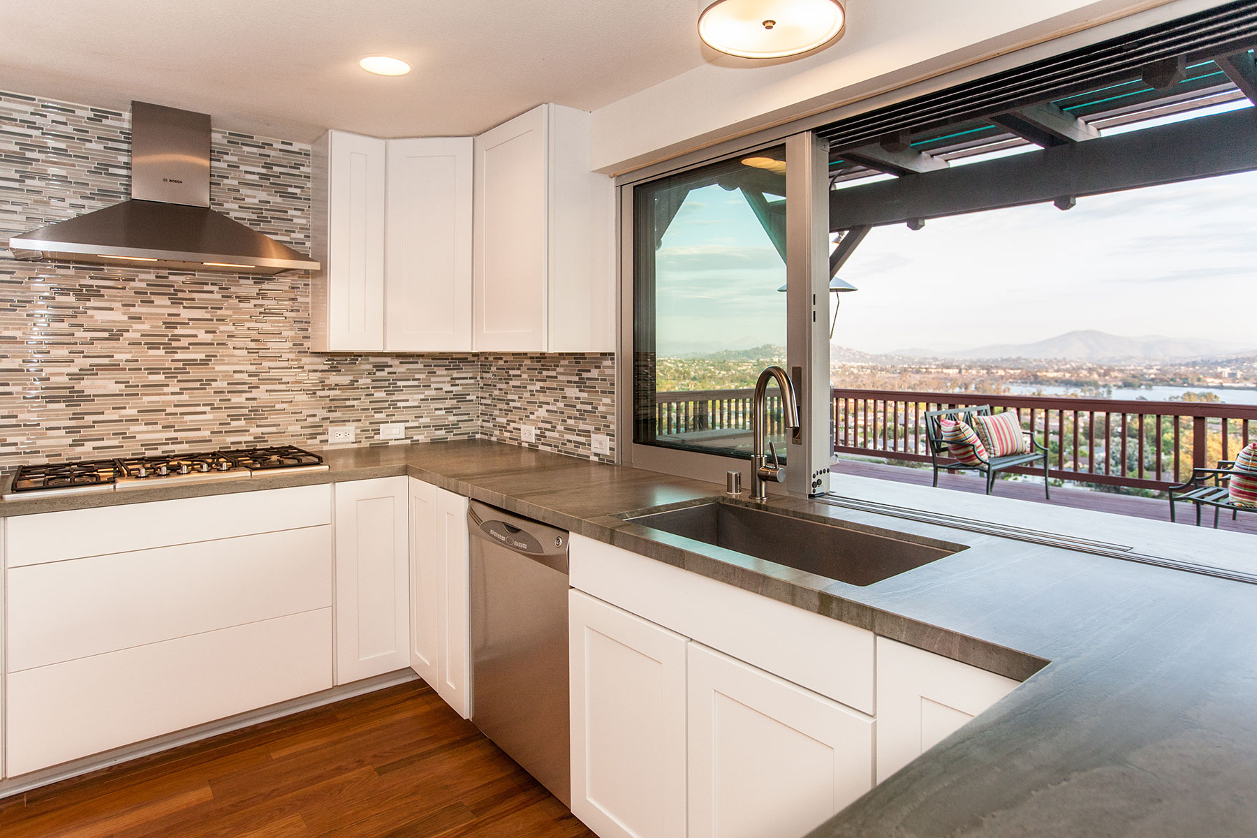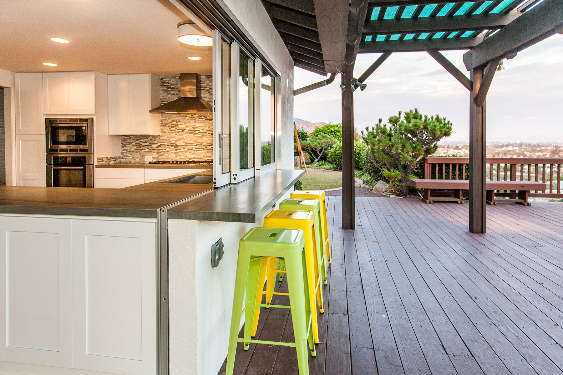 After purchasing a fairly typical suburban home in Del Cerro, a neighborhood of sunny San Diego, these homeowners naturally wanted the California living style. With an extraordinary view from the back patio that didn’t translate into their kitchen and living area, they weren’t going to let anything stand in their way – not even a wall. So, after a short design period the wall separating them from their gorgeous view came down. With a new 24’ beam installed overhead, in its place went a large sliding glass door and window system by Western Windows. The new door opened the owner’s living room wide onto the deck. Unlike many door applications though, this system extended as the window that divides the kitchen counter and the bar outside. Opening this kitchen window allows fluent conversation, easy serving and of course reveals an expansive view.