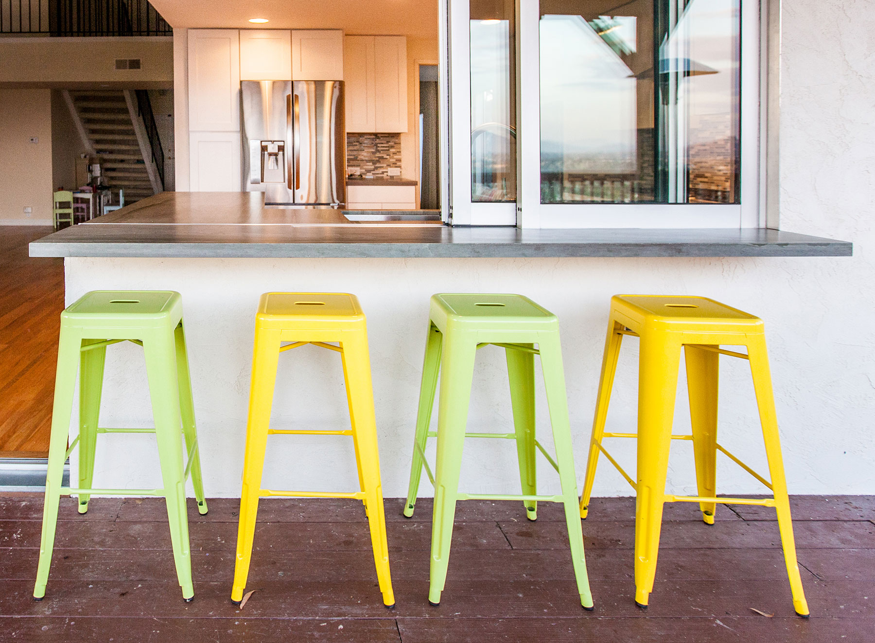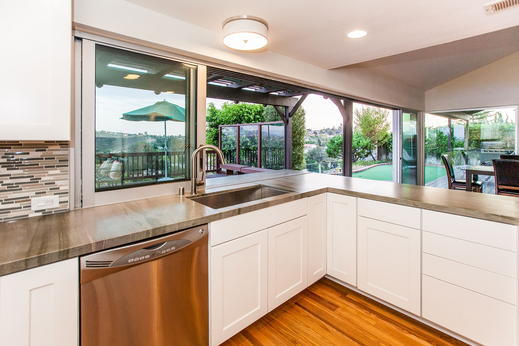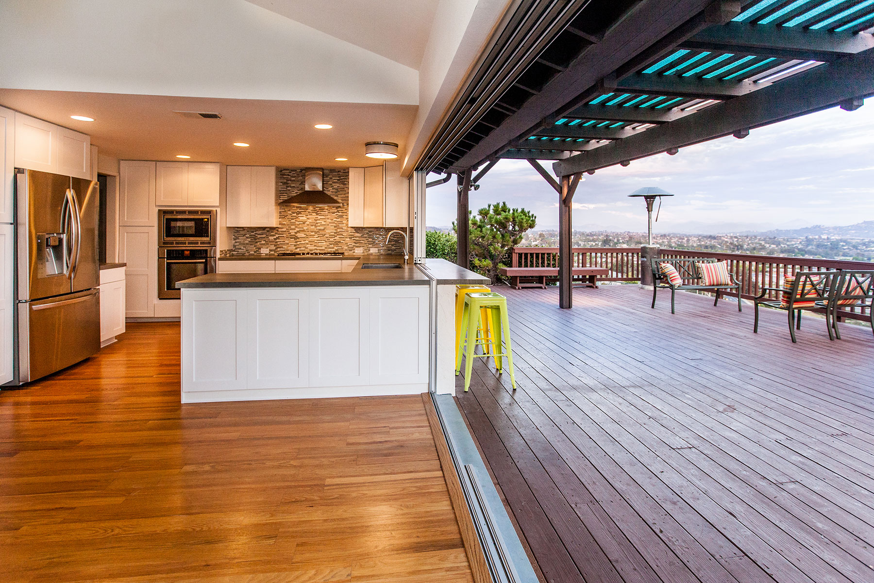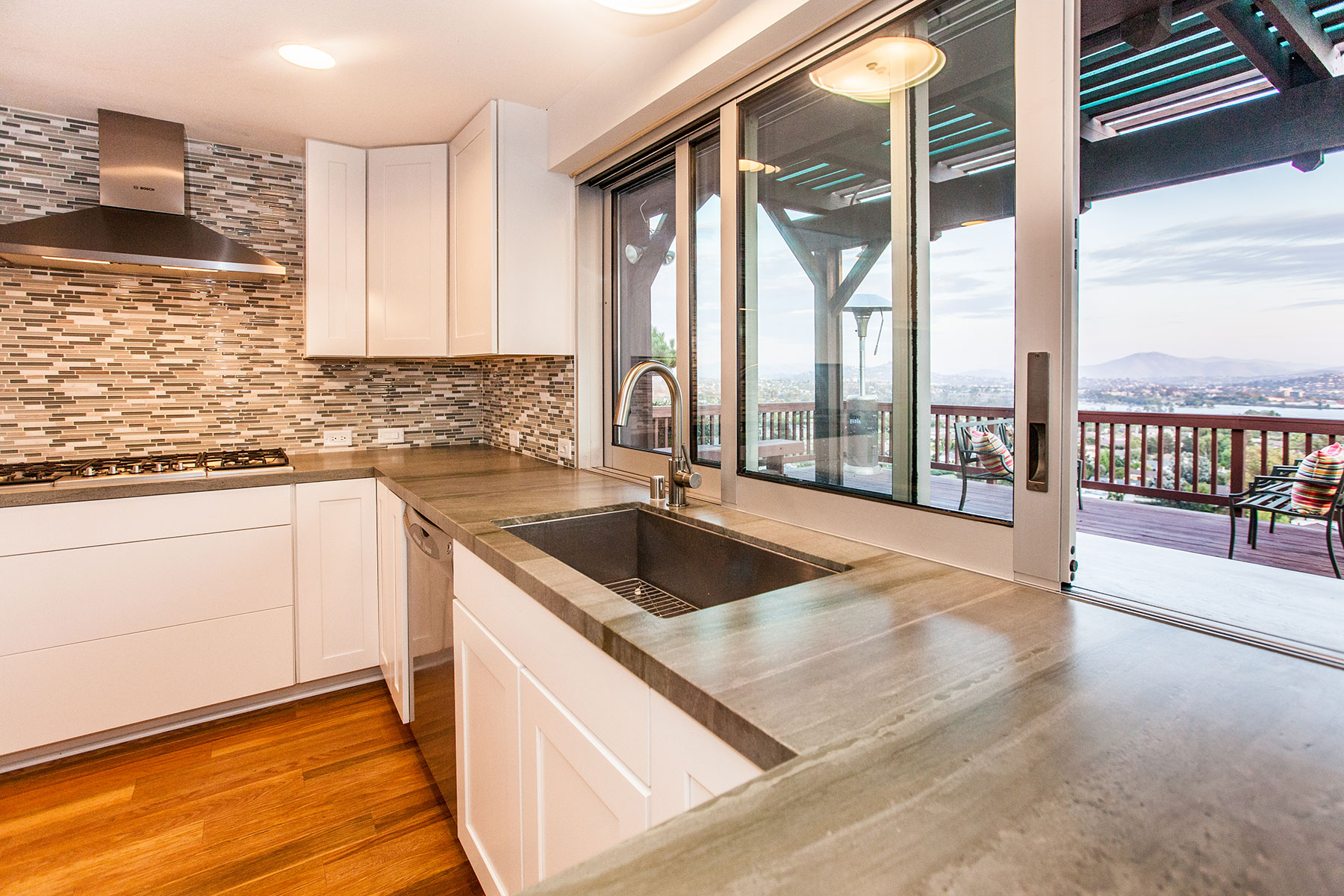 After purchasing a fairly typical suburban home in Del Cerro, a neighborhood of sunny San Diego, these homeowners naturally wanted the California living style. With an extraordinary view from the back patio that didn’t translate into their kitchen and living area, they weren’t going to let anything stand in their way – not even a wall. So, after a short design period the wall separating them from their gorgeous view came down. With a new 24’ beam installed overhead, in its place went a large sliding glass door and window system by Western Windows. The new door opened the owner’s living room wide onto the deck. Unlike many door applications though, this system extended as the window that divides the kitchen counter and the bar outside. Opening this kitchen window allows fluent conversation, easy serving and of course reveals an expansive view.