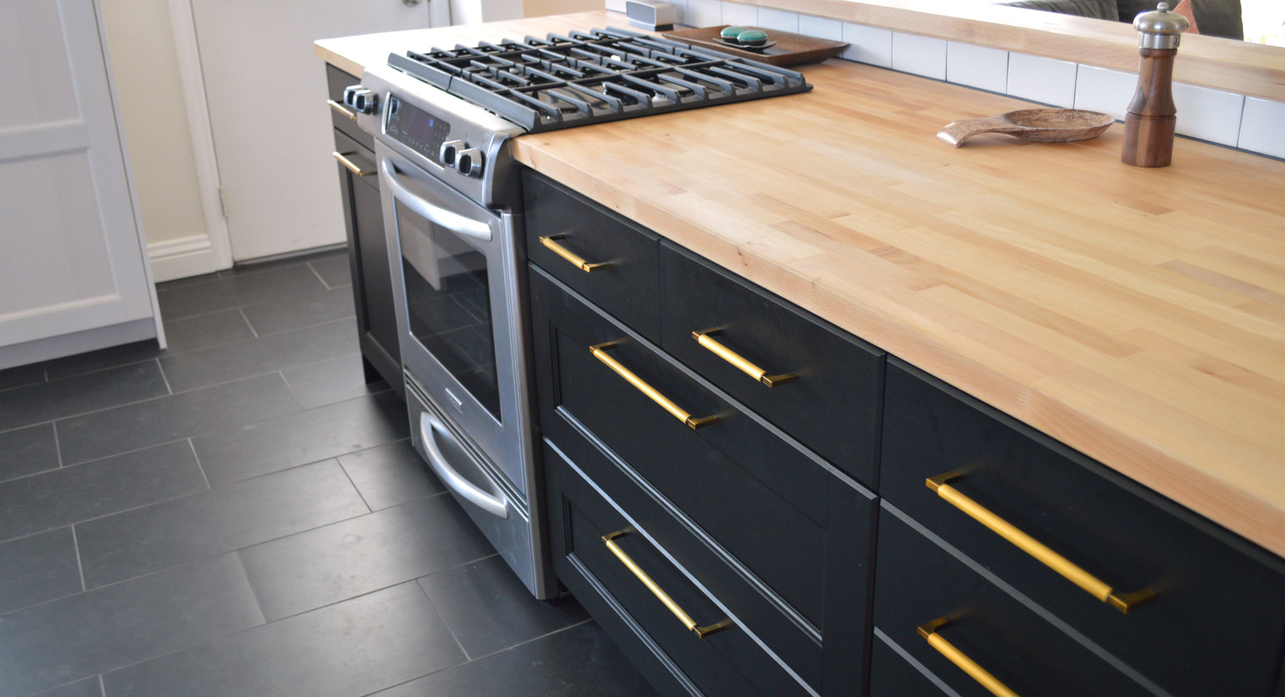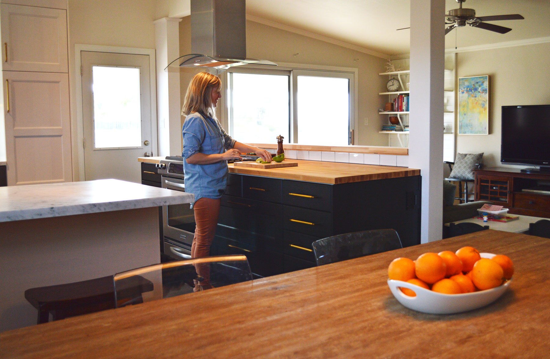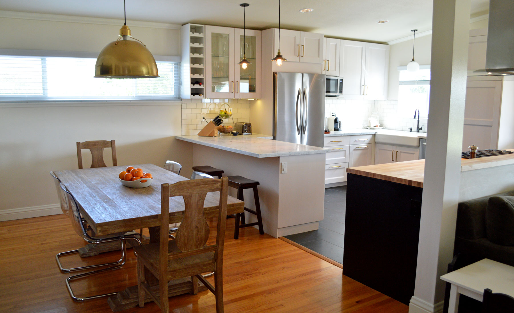 After demo the kitchen took on its new life. While white cabinets with a marble countertop adorn most of the kitchen, these homeowners opted for an interesting contrast by complimenting with black cabinets and a light wood butcher block countertop for the island. A new black tile floor was laid down, bronze hardware installed and rustic modern lighting added.