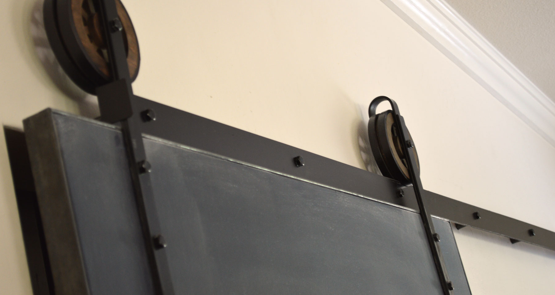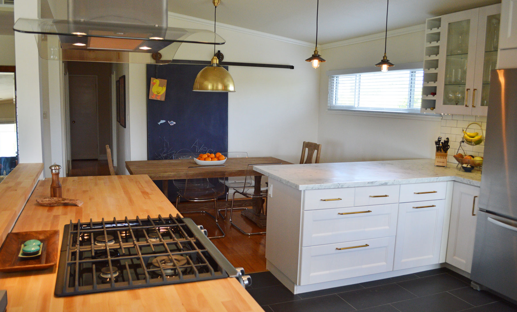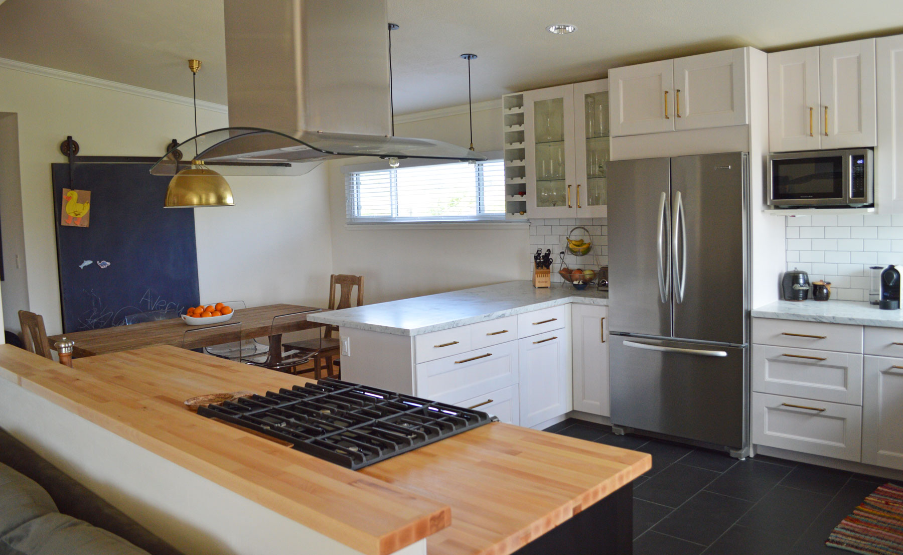 No kitchen is complete though without a barn door chalkboard for the pantry, so we custom built one. With some some time in our wood and metal shop, chalkboard paint, and hardware that the homeowner found on Etsy, her little one now has a really big coloring book.
