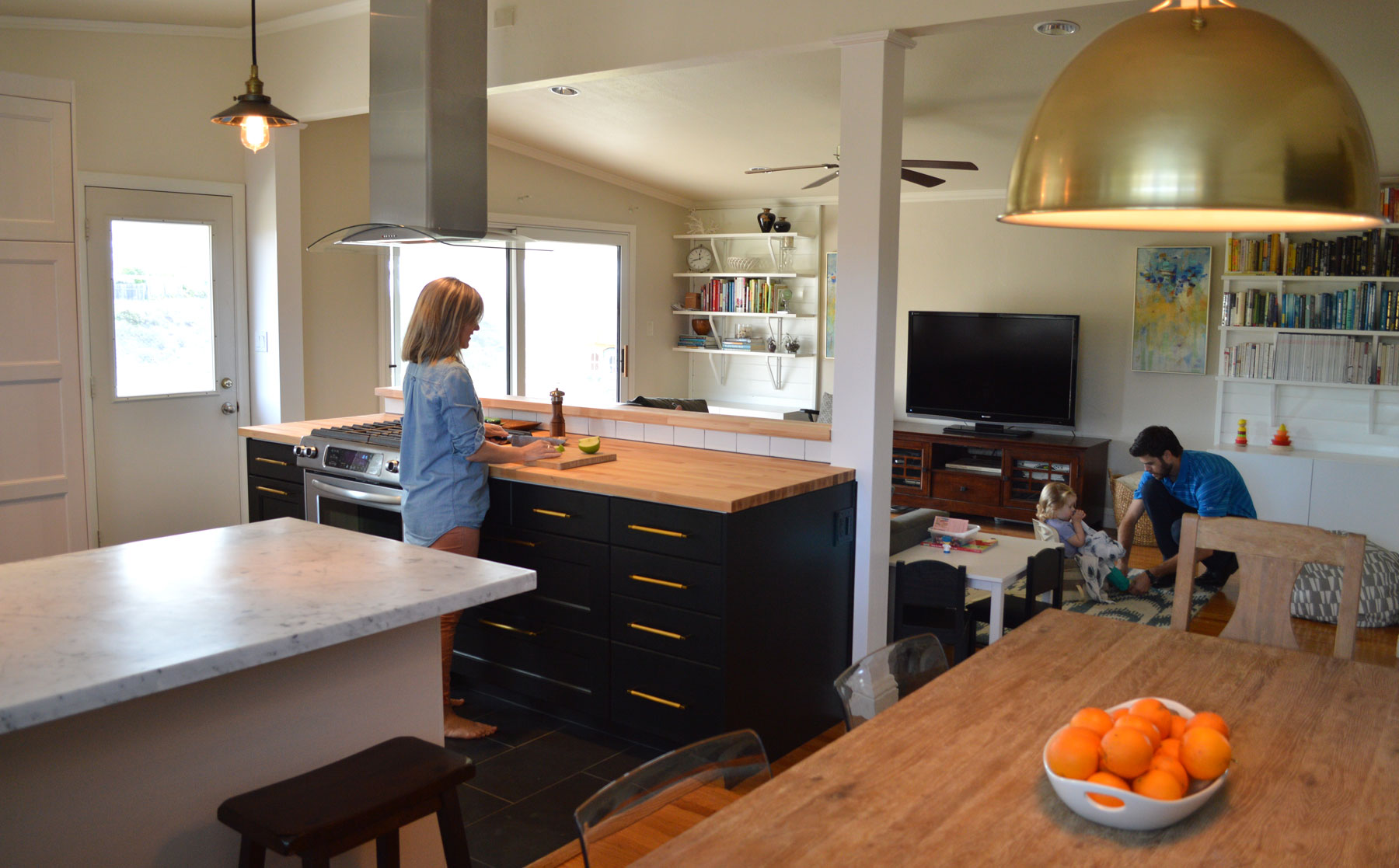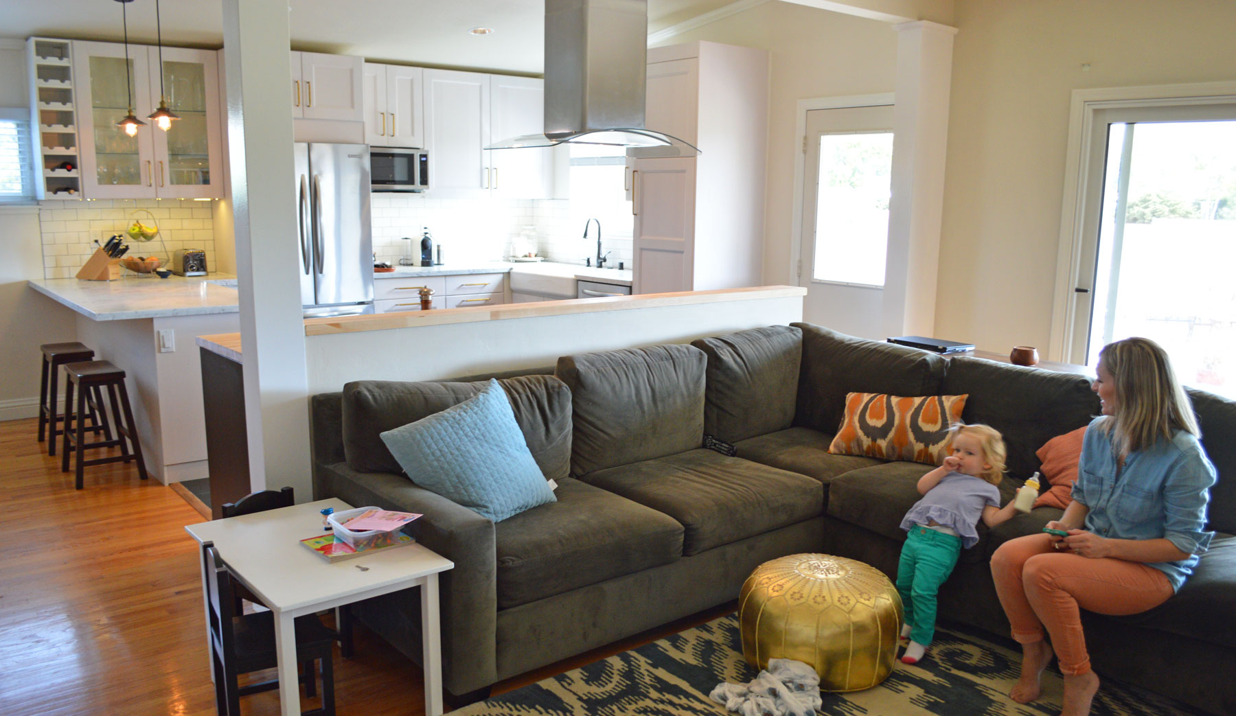Moving into a house already with a desire to change the kitchen isn’t exactly odd these days. These homeowners had an extra motive though for undertaking their kitchen remodel: a 1 ½ year old isn’t the greatest sous-chef, but with a wall blocking sight lines between the kitchen and adjacent living room, leaving her to play around the corner unsupervised wasn’t acceptable either. So they did what any responsible parent would do, they brought us in to tear down the wall.