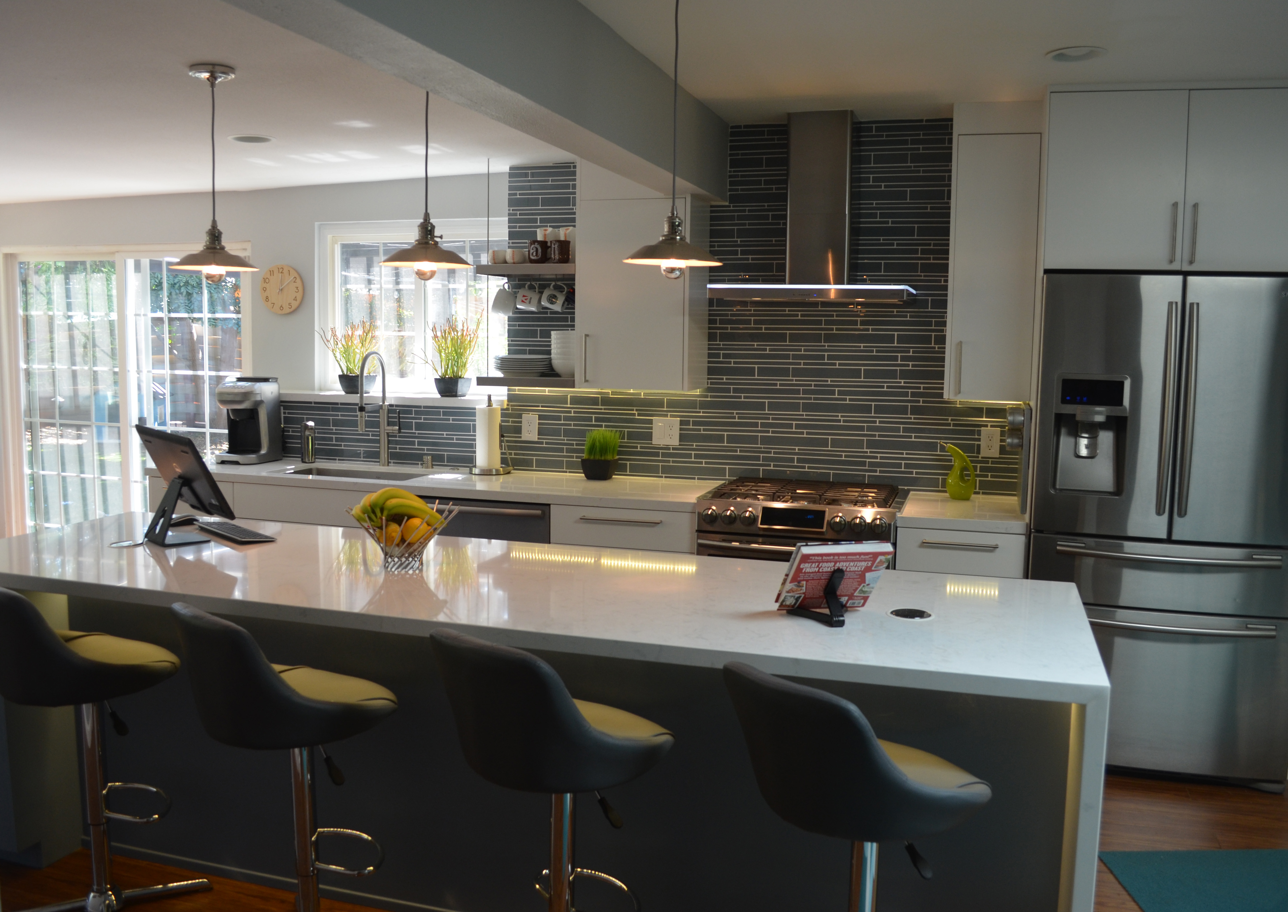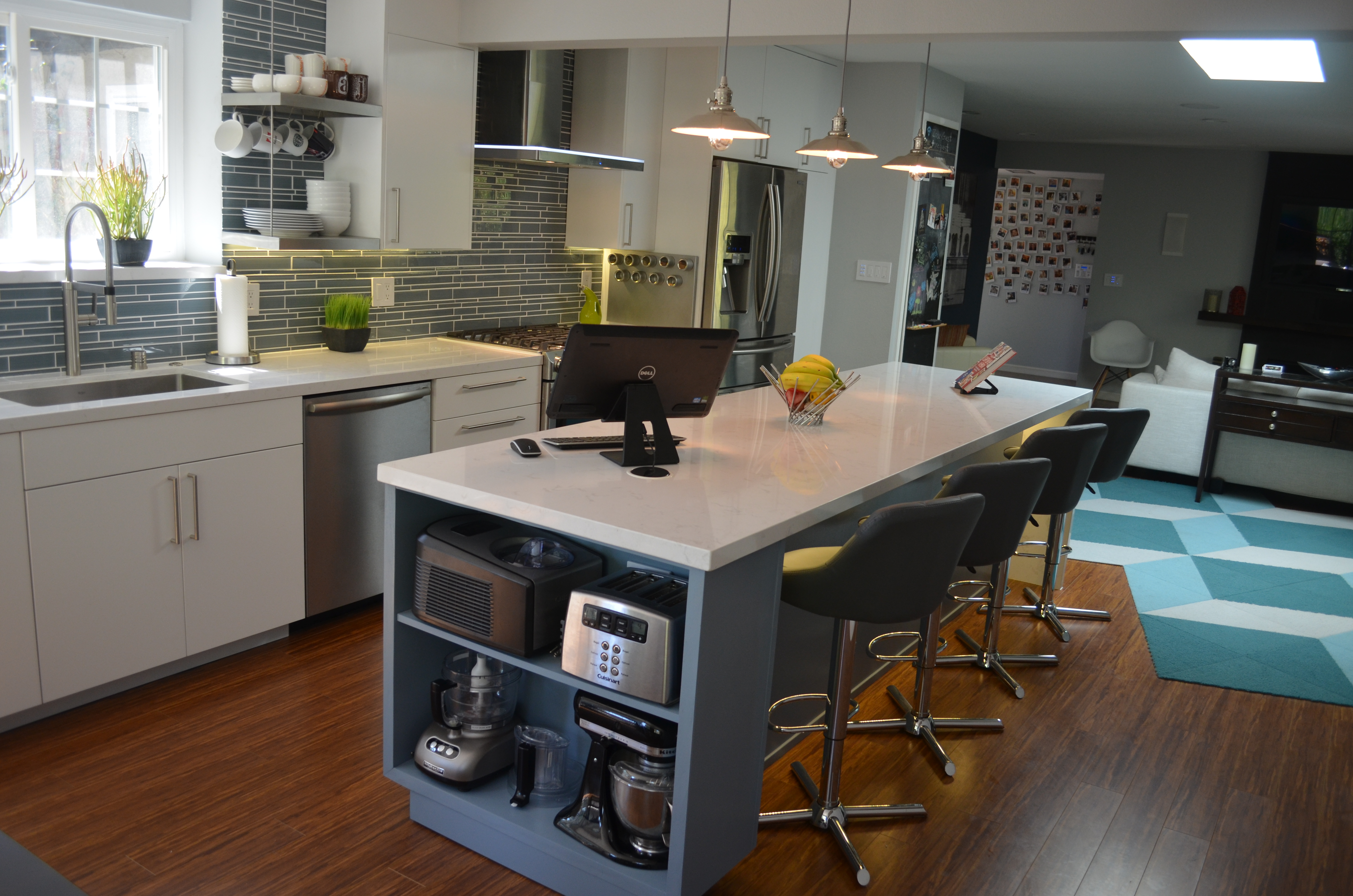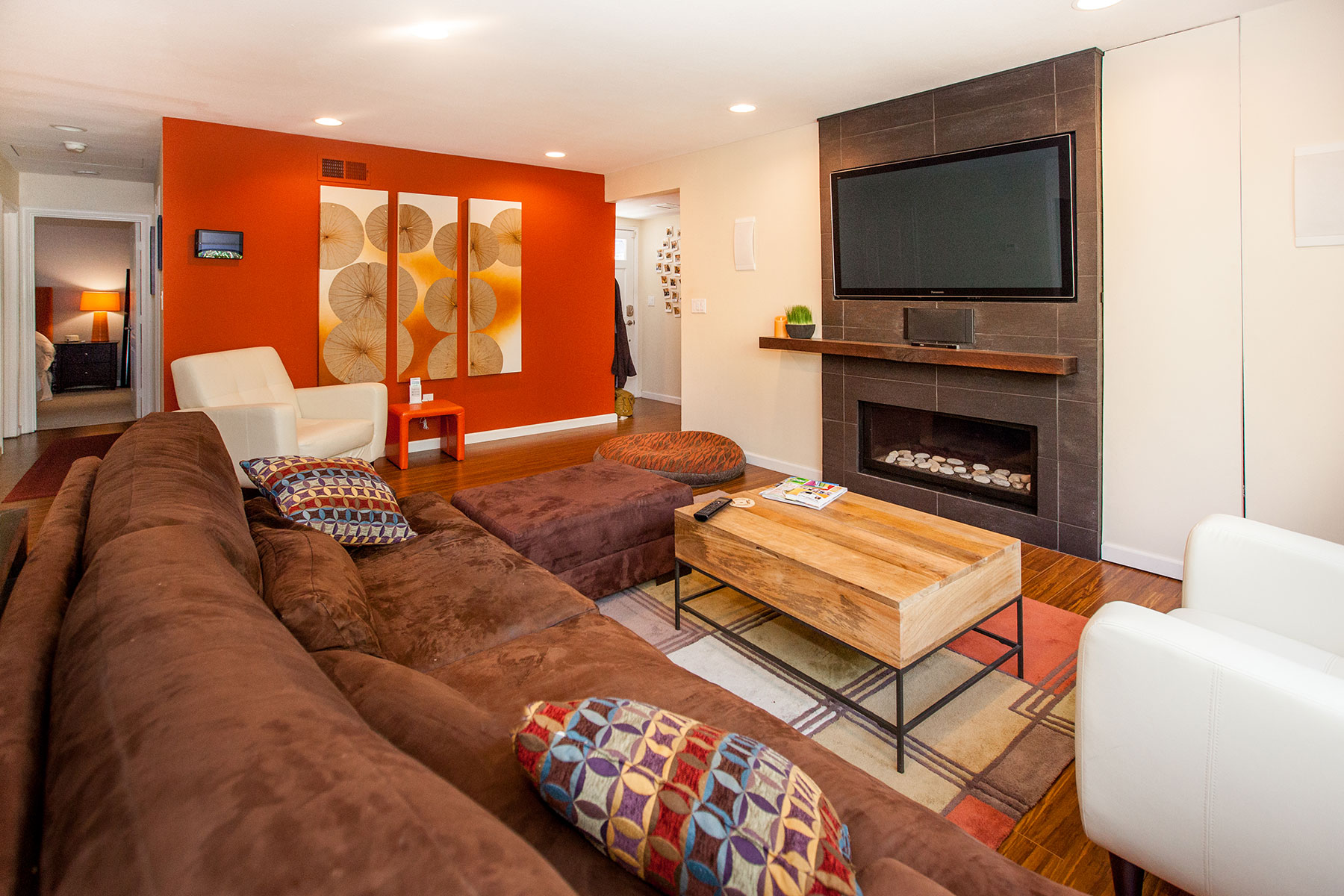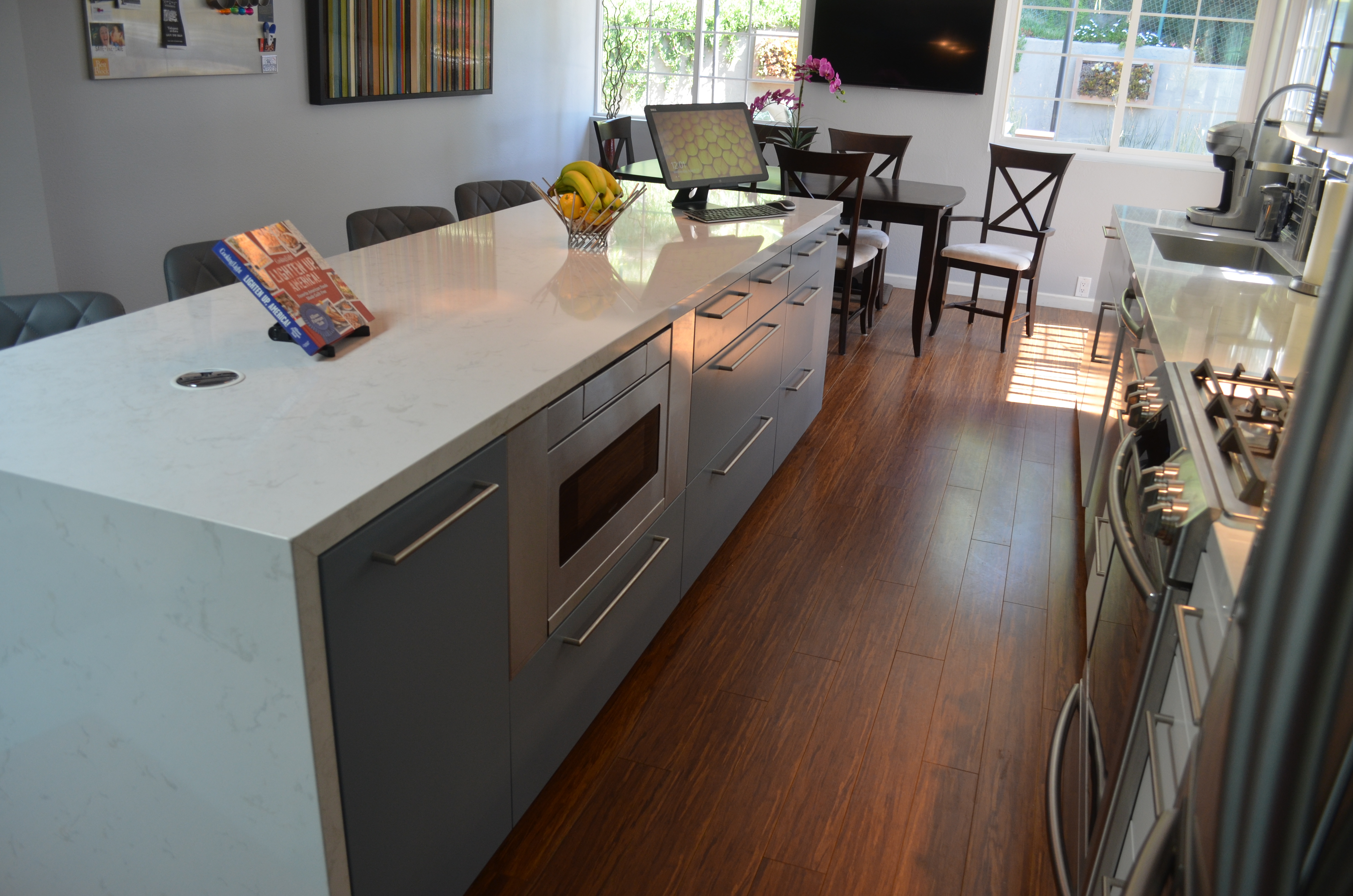 The Montclair project let us really explore how far we can take a multi room space and combine form and function for a exceptionally creative solution. The bathrooms brought in the Zen with the accents of bamboo and jade. The adjacent scarlet red wall added the kick of color in the cool living space as we built in the media shelves into the wall to compliment the flush mounted TV above the fire place. Additional space was created in the kitchen by the use of a long center island where we built in the microwave to the structure and created a nice social area. The power outlets for media are on a push and power glide rise for when in need.