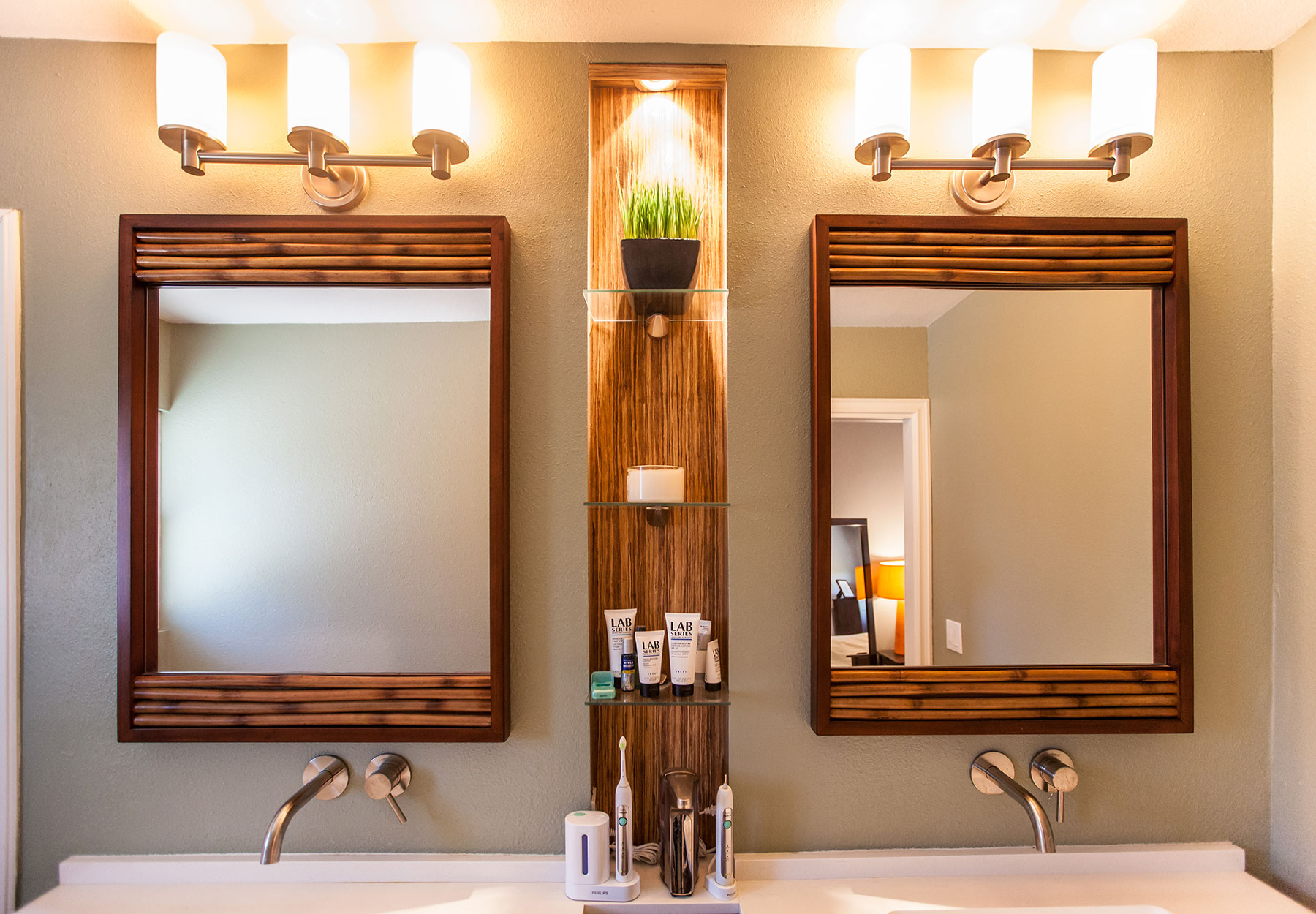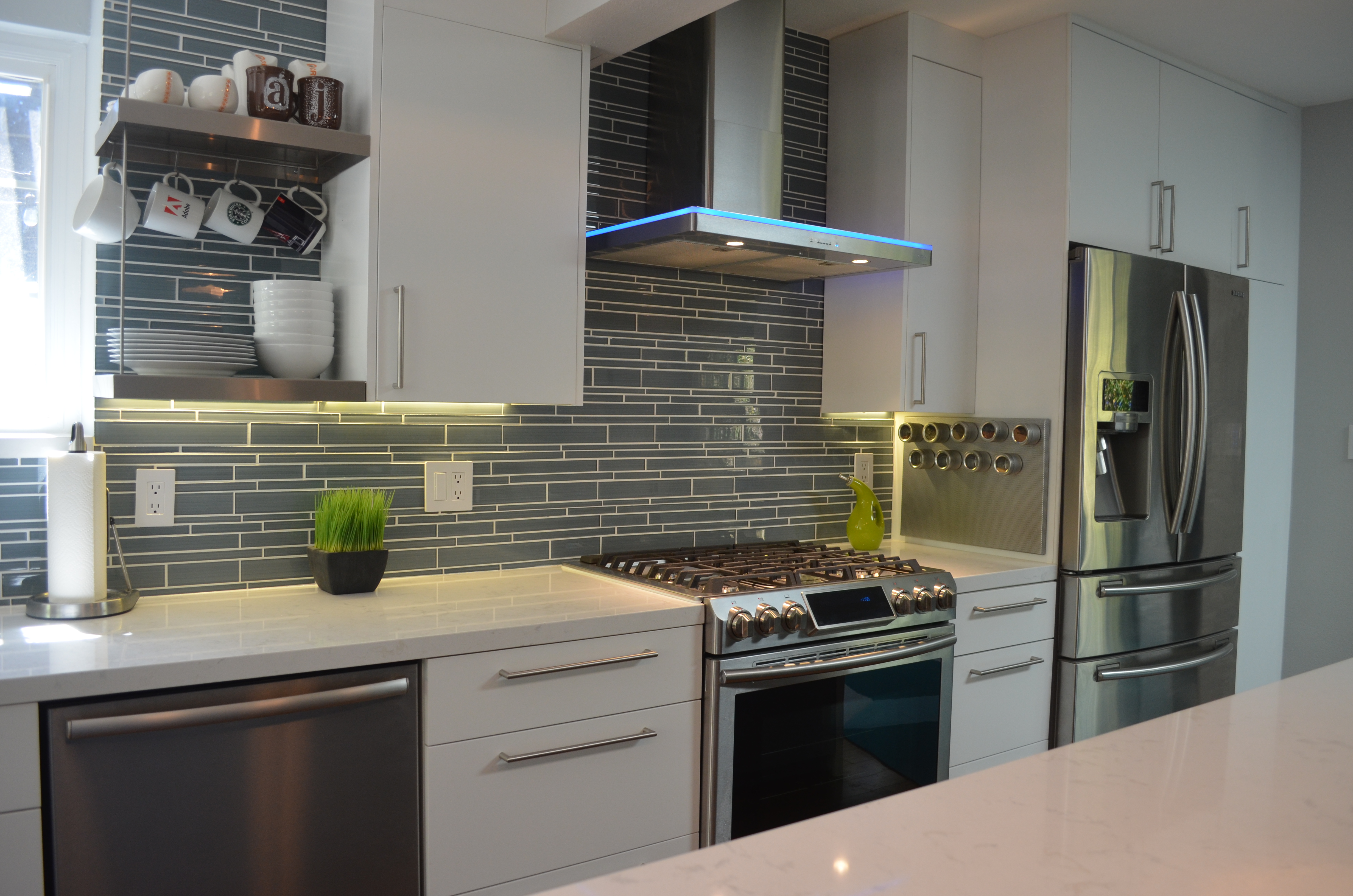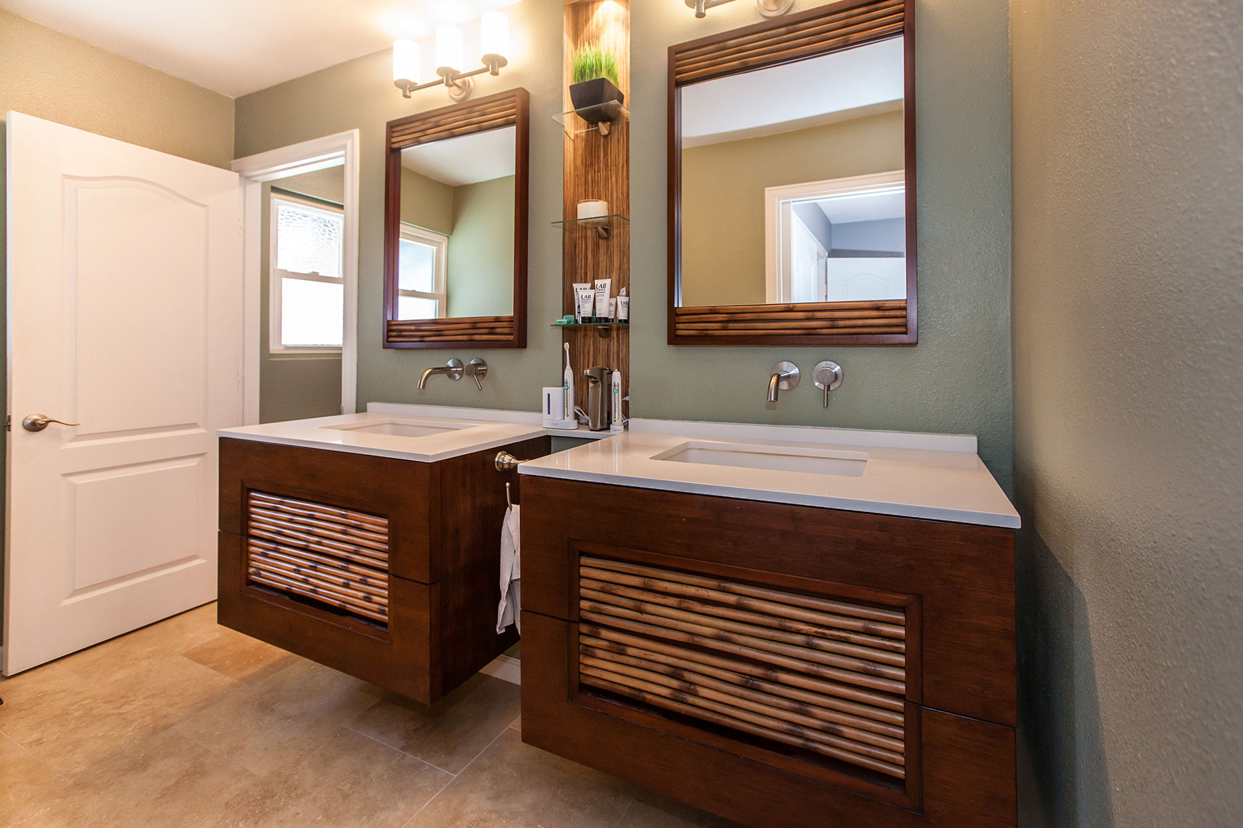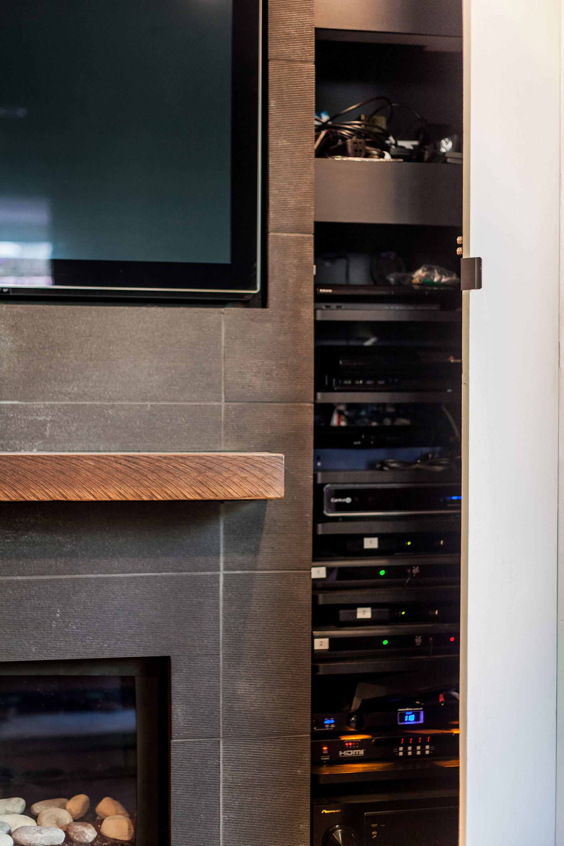 The Montclair project let us really explore how far we can take a multi room space and combine form and function for a exceptionally creative solution. The bathrooms brought in the Zen with the accents of bamboo and jade. The adjacent scarlet red wall added the kick of color in the cool living space as we built in the media shelves into the wall to compliment the flush mounted TV above the fire place. Additional space was created in the kitchen by the use of a long center island where we built in the microwave to the structure and created a nice social area. The power outlets for media are on a push and power glide rise for when in need.