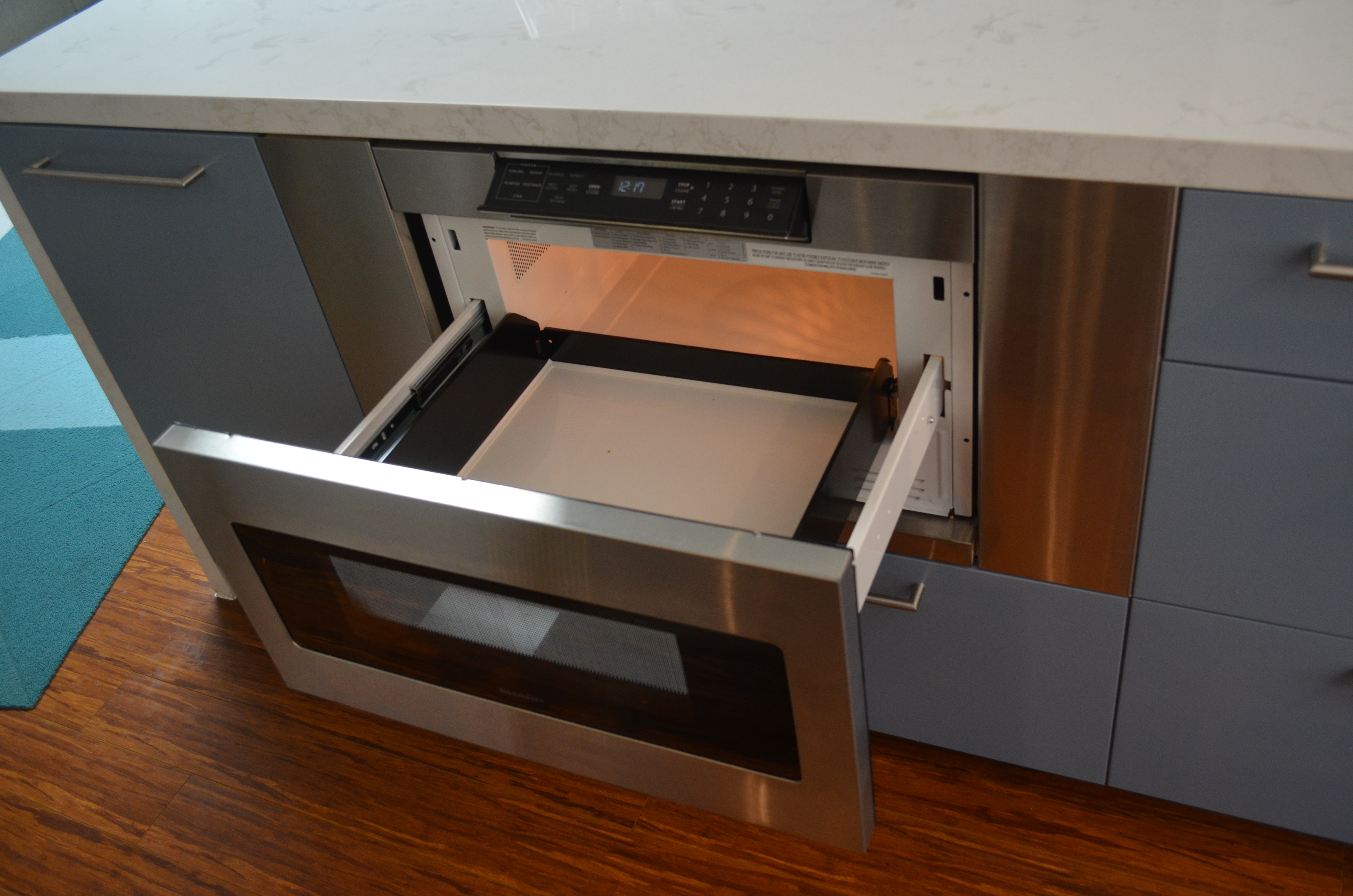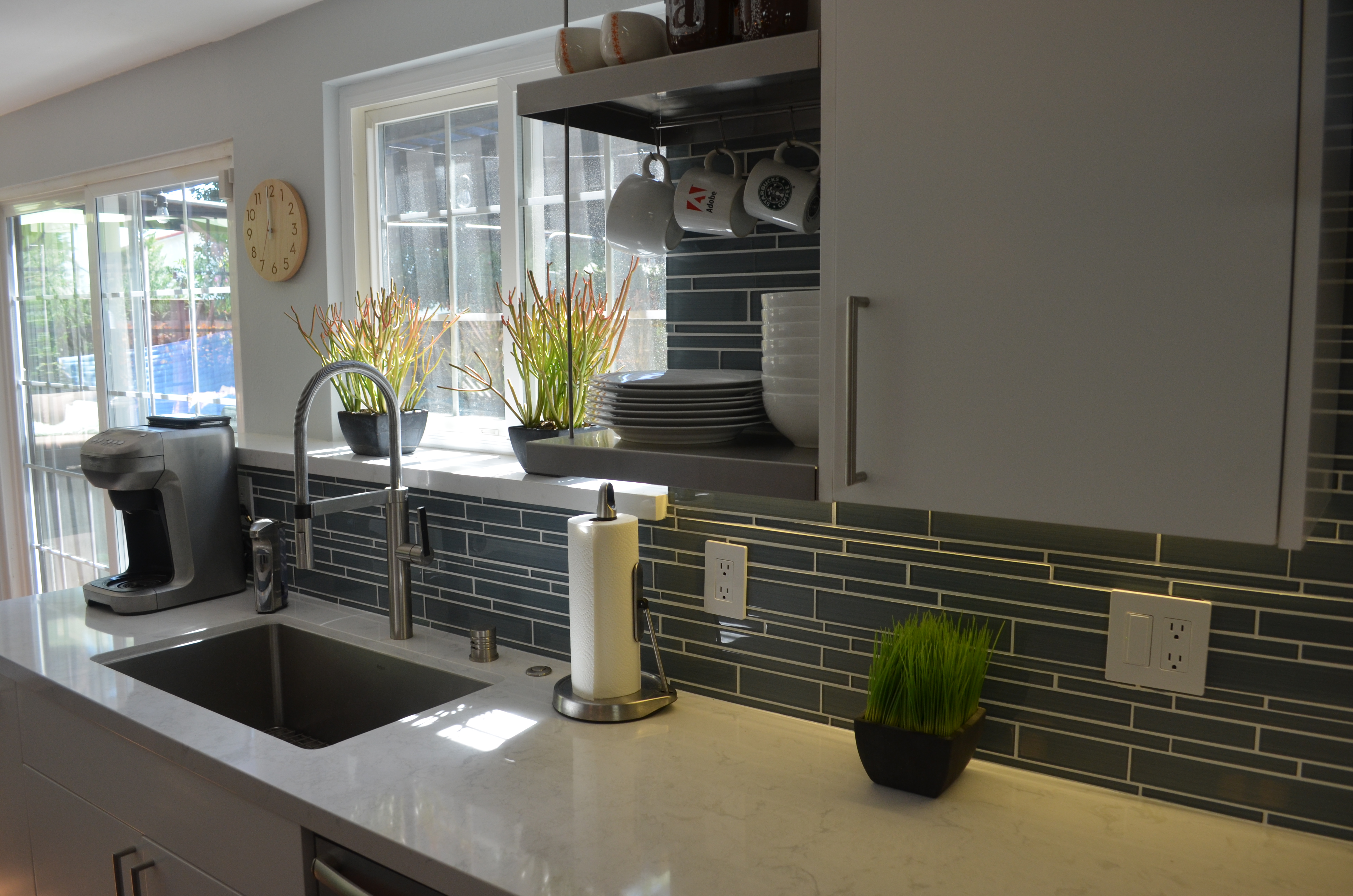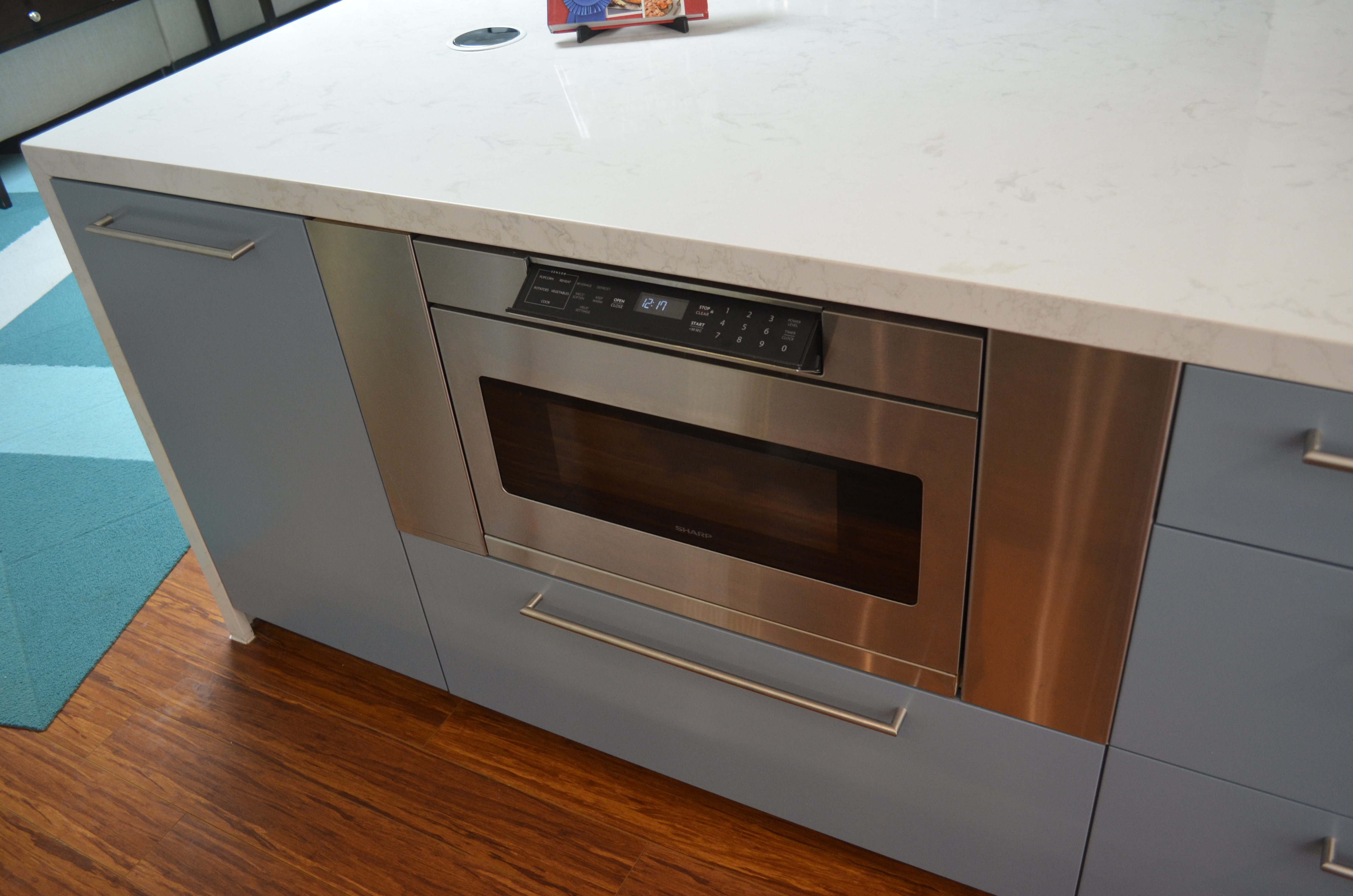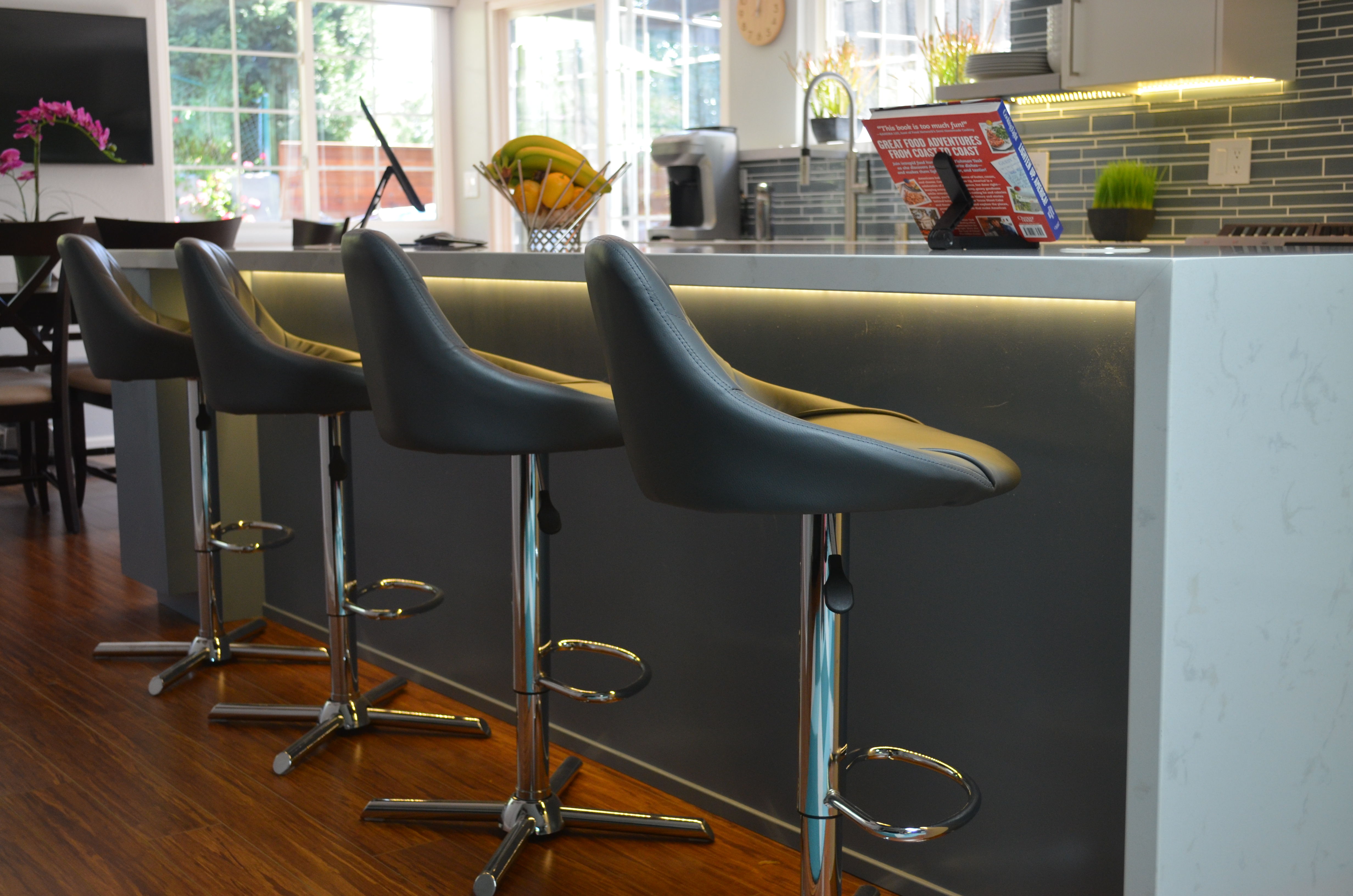The Montclair project let us really explore how far we can take a multi room space and combine form and function for a exceptionally creative solution. The bathrooms brought in the Zen with the accents of bamboo and jade. The adjacent scarlet red wall added the kick of color in the cool living space as we built in the media shelves into the wall to compliment the flush mounted TV above the fire place. Additional space was created in the kitchen by the use of a long center island where we built in the microwave to the structure and created a nice social area. The power outlets for media are on a push and power glide rise for when in need.